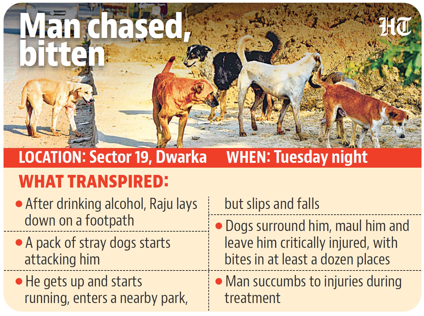 On Tuesday night, Raju reportedly consumed alcohol and lay down on a footpath behind the school. CCTV footage recovered from the area shows a group of stray dogs attacking him. In an attempt to escape, Raju can be seen getting up and running, but the dogs chase him. He then enters a nearby park, where he slips and falls, after which the dogs surround and maul him, the officer said.