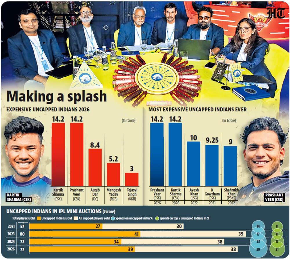 With an increasing number of state T20 leagues acting as a feeder line, the number of uncapped players picked up at auctions has been steadily rising. More importantly, the spending on these players has skyrocketed, suggesting franchises trust them to come good right away. The top five uncapped Indians accounted for 21% of the total spends in the 2026 auction; this proportion was a sharp rise compared to previous mini auctions. It was 15% in 2024 and 11% in 2021 and ‘23.