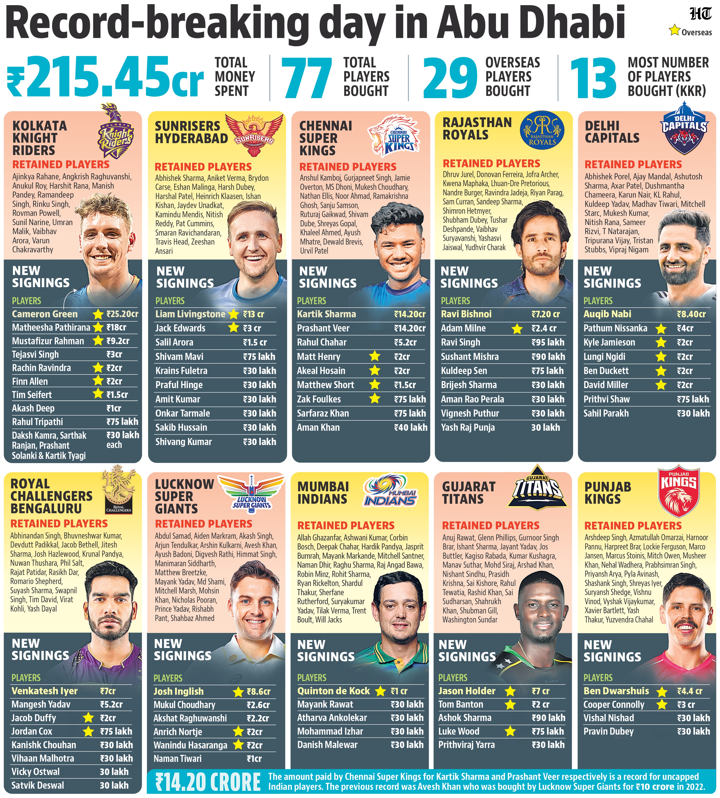 Mumbai: The IPL player auctions have changed the lives of many players by introducing meritocracy through free market economics. Add Karthik Sharma, the 19-year-old wicket-keeper batter from Rajasthan, and Prashant Veer, the 20-year-old left-arm spin all-rounder from Uttar Pradesh, to that list. Their big pay day - ₹ 14.2 crore each - at the IPL mini auction in Abu Dhabi on Tuesday meant they will now be playing for the Chennai Super Kings with the legendary MS Dhoni still in the squad.