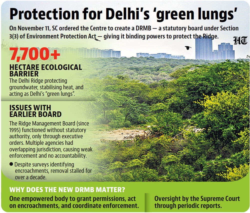 On November 11, a bench of then Chief Justice of India BR Gavai and justice K Vinod Chandran asked the Union ministry of environment, forests and climate change (MoEFCC) “to constitute DRMB by issuing notification under Section 3(3) of the EP Act,” so that it has teeth to act. In that order, the court said that DRMB needs statutory backing, and pointed out that while there were several entities looking after the Ridge, the overlapping jurisdictions made all of them sub-optimal. The court also said the DRMB thus created would focus on the removal of encroachments and also oversee afforestation.