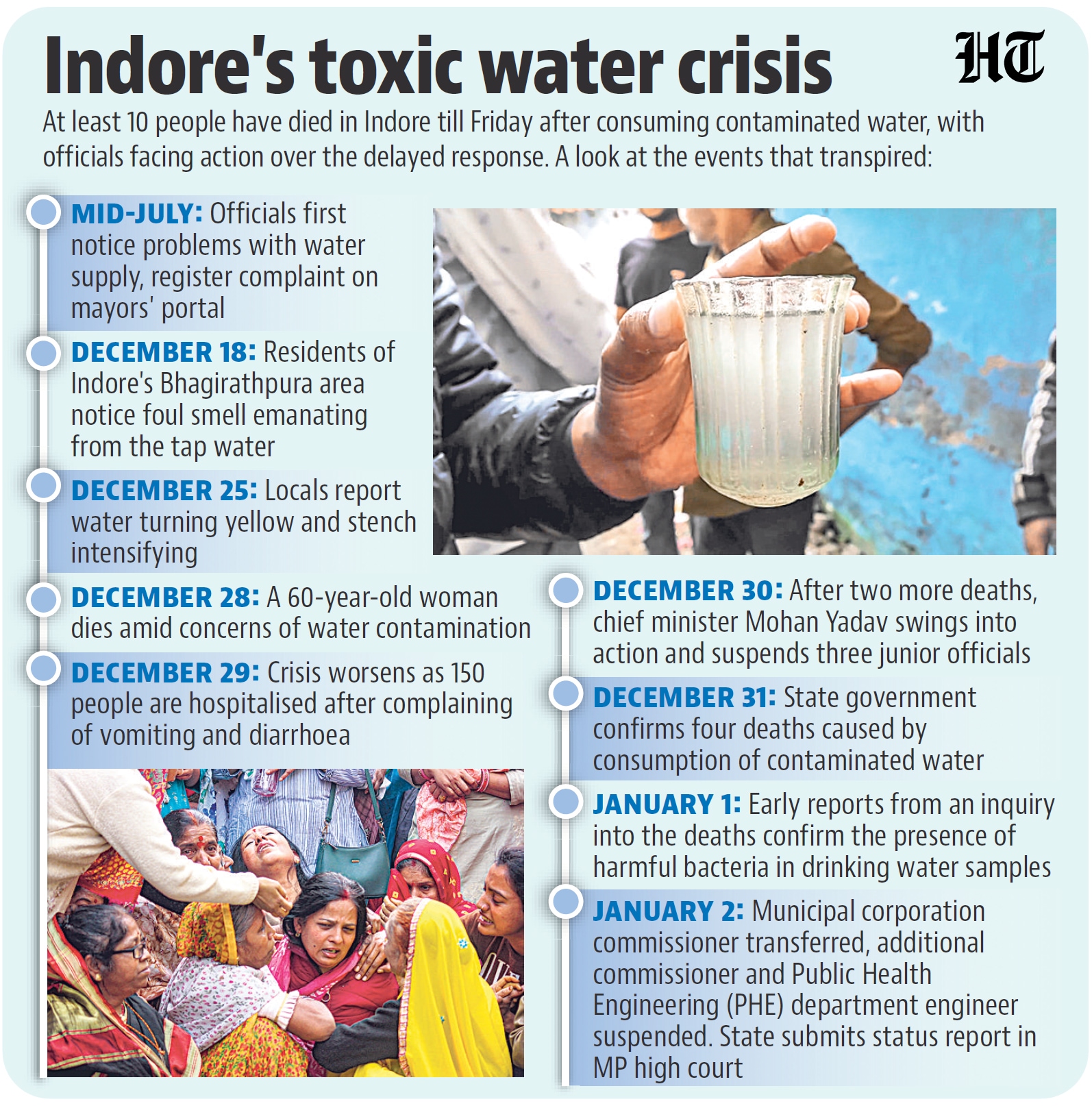 The crisis became public on December 29, a day after aresident of Bhagirathpura died after complaining of vomiting and diarrhoea. Since then, officials have confirmed that sewage mixed with drinking water supply after a toilet was built with no safety checks.