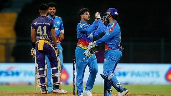Kuldeep Yadav of Delhi Capitals celebrates with teammates(IPL)