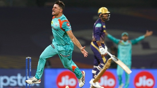 Marcus Stoinis of Lucknow Super Giants celebrates winning the IPL 2022 match against Kolkata Knight Riders.(IPL)